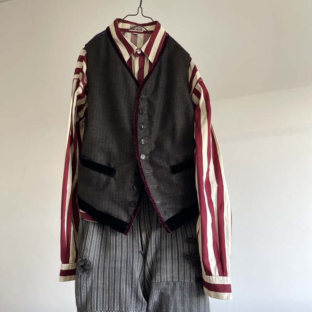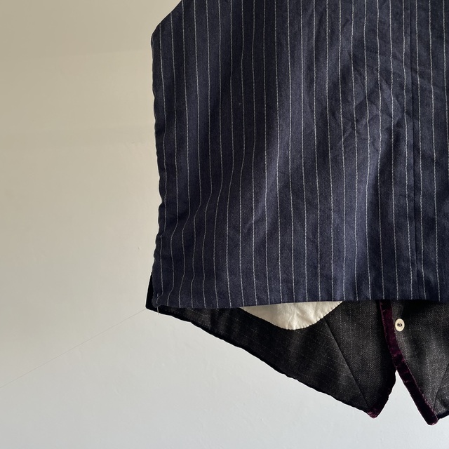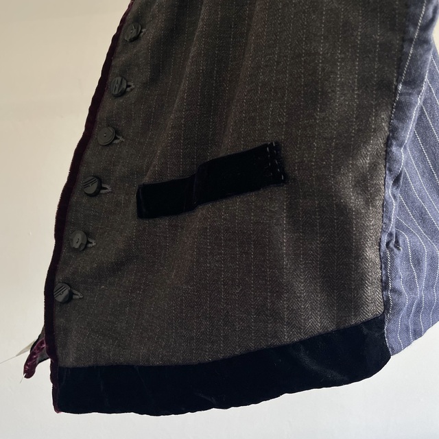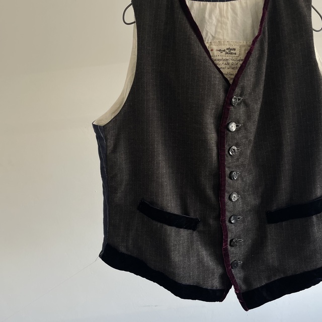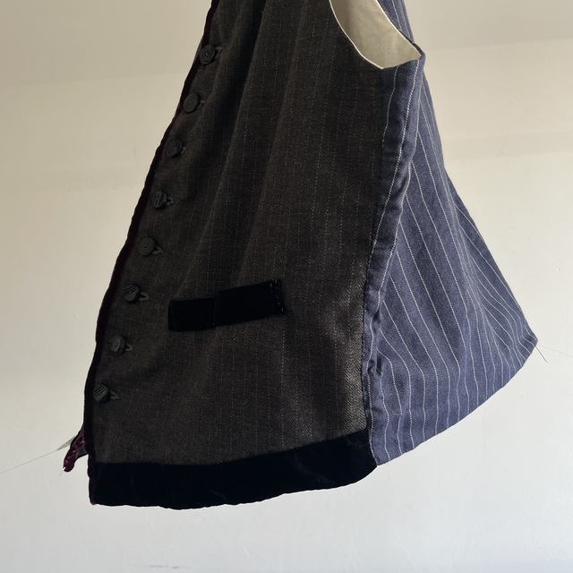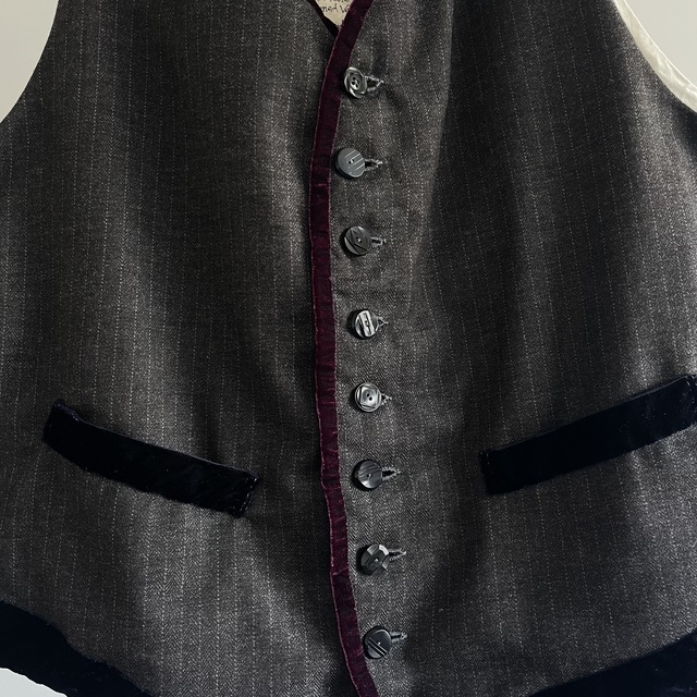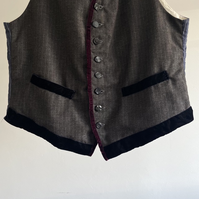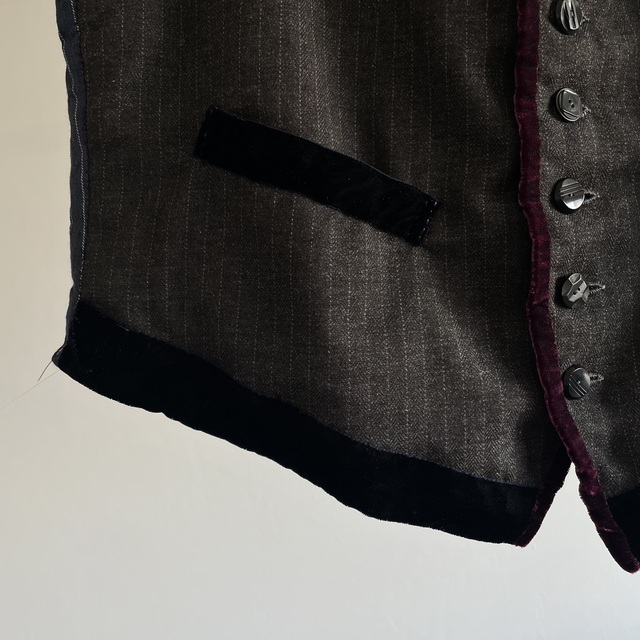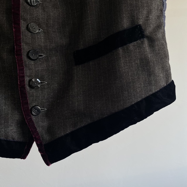 French Vintage Wool Herringbone Stripe Fabric Made Gilet with Hand Trimmed Velvet Ribbon