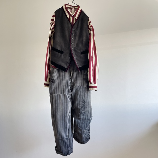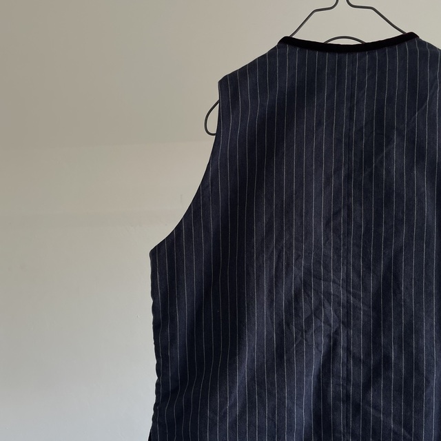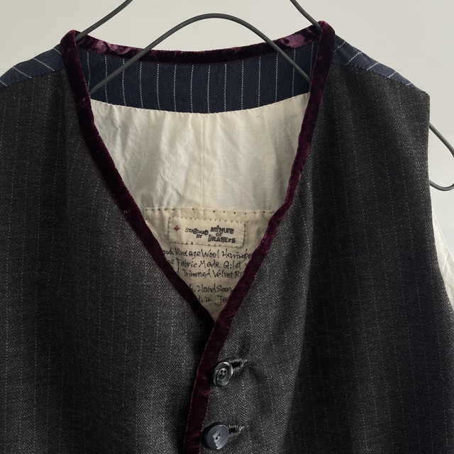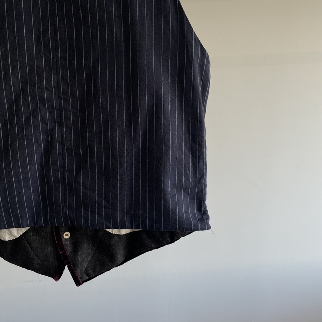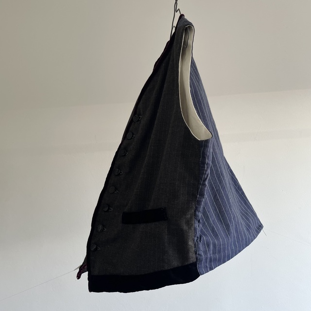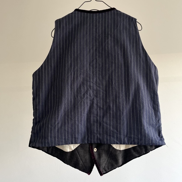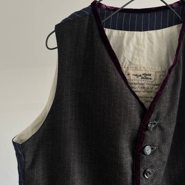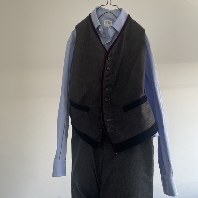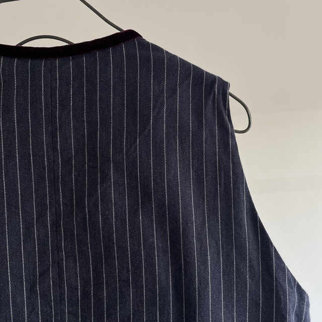 French Vintage Wool Herringbone Stripe Fabric Made Gilet with Hand Trimmed Velvet Ribbon