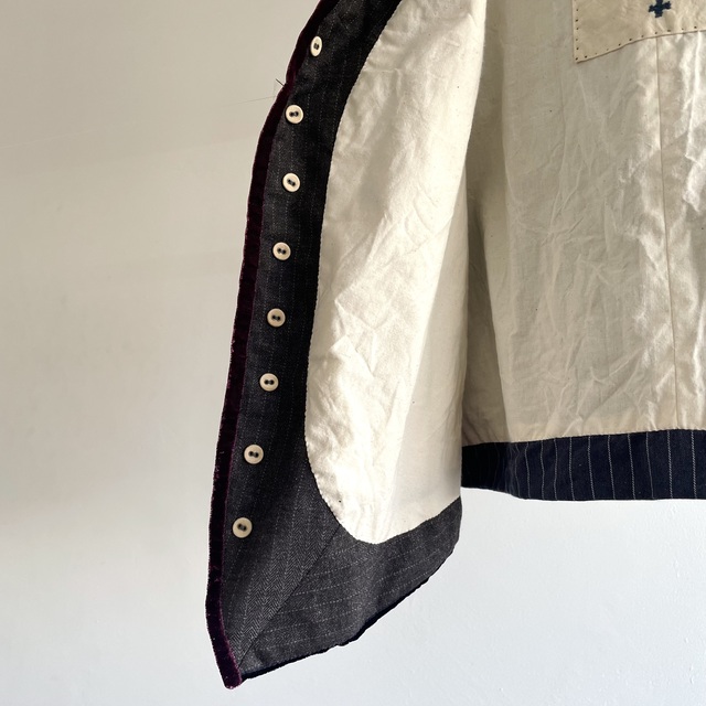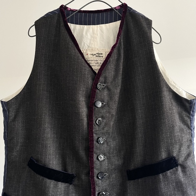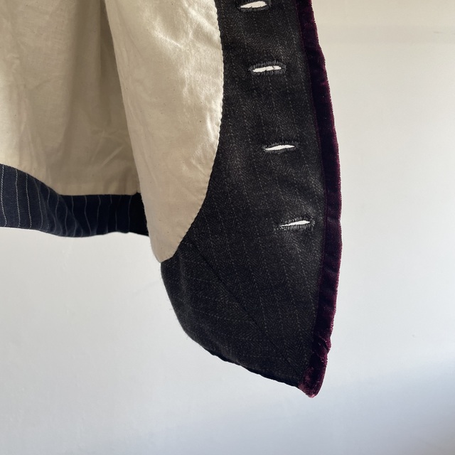 This piece has the classic Gilet shape with compact shoulders and a snug fit, with velvet and velvet accents.