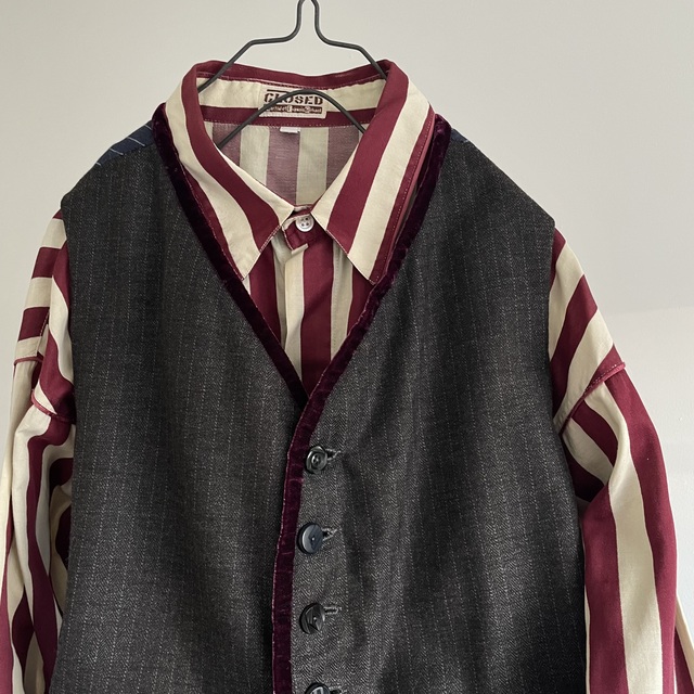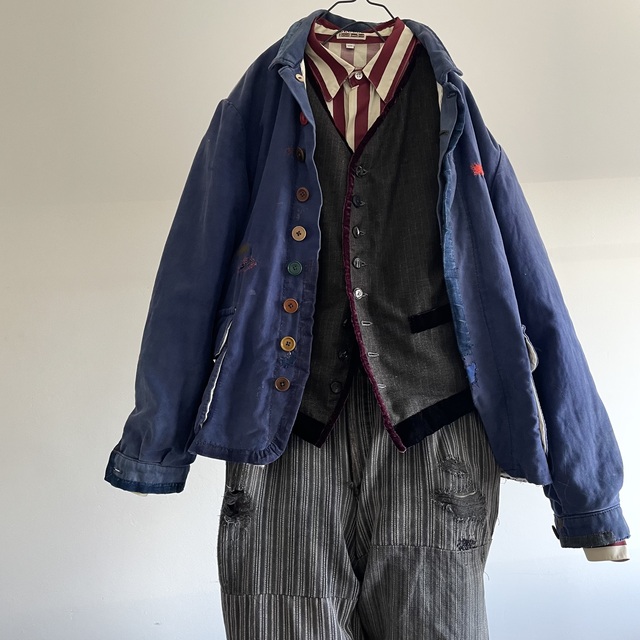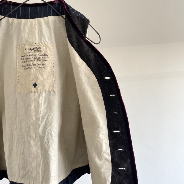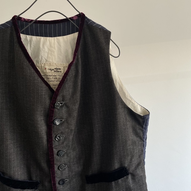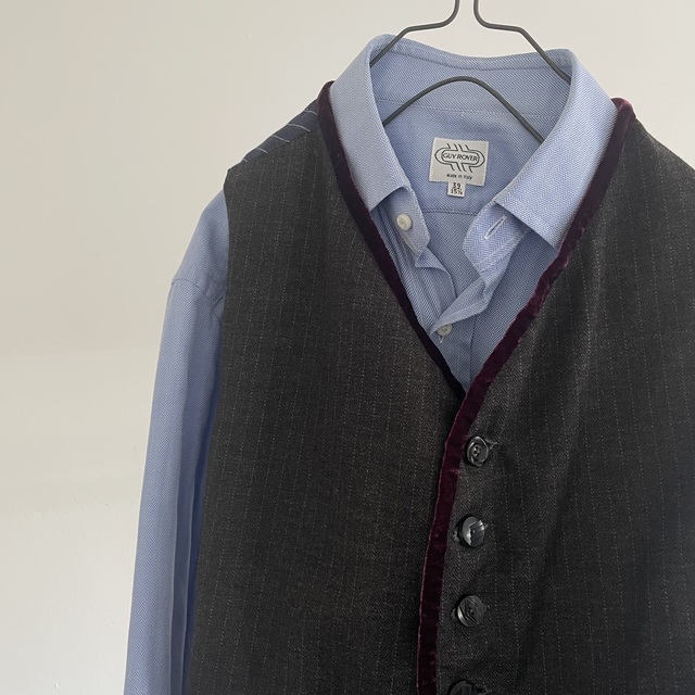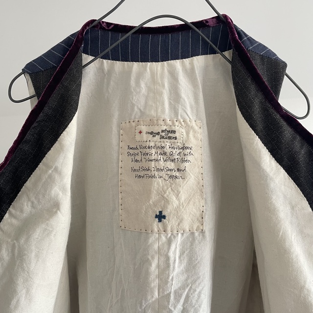 コンパクトな肩と身体に沿うフィット感のオーソドックスなGiletのフォルムに、別珍とベルベットのアクセントを加えた1枚です。
