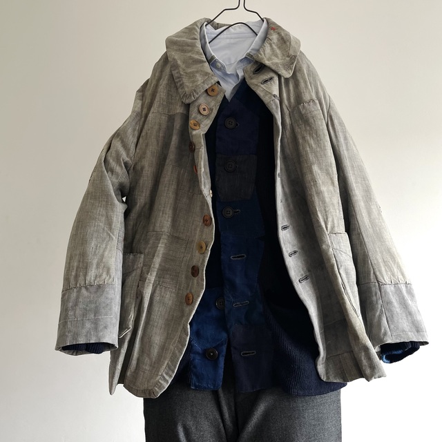 Vintage and antique indigo dyed linen that surrounds the placket and is hand-sewn with patches.