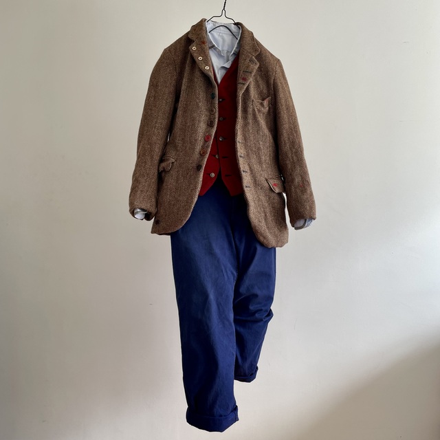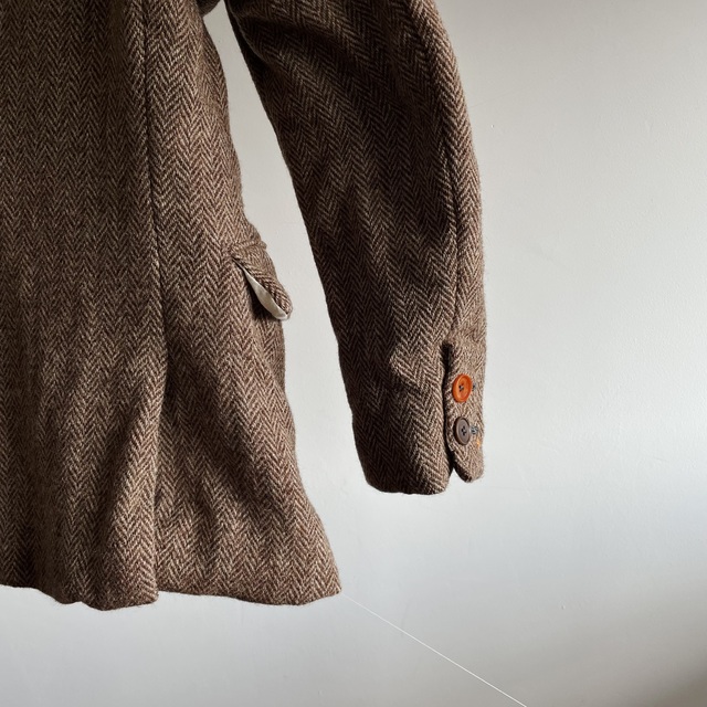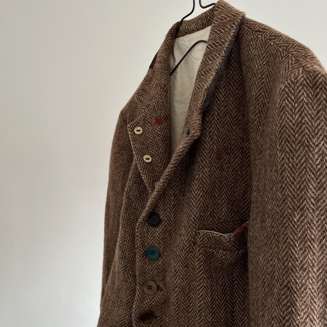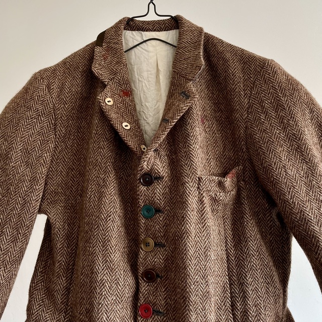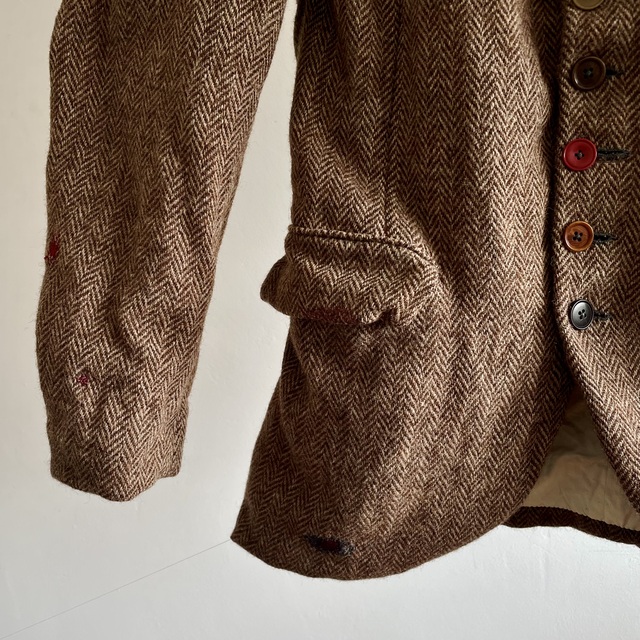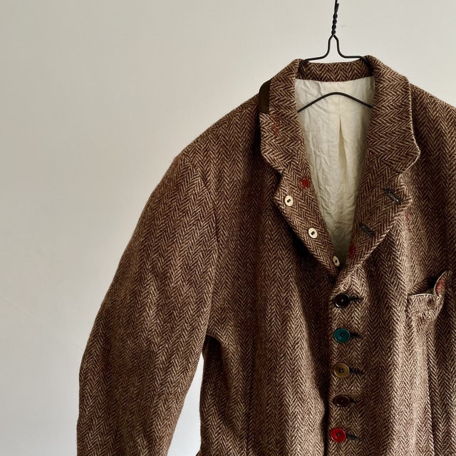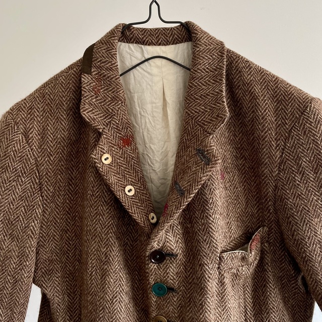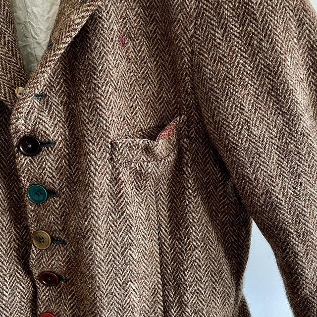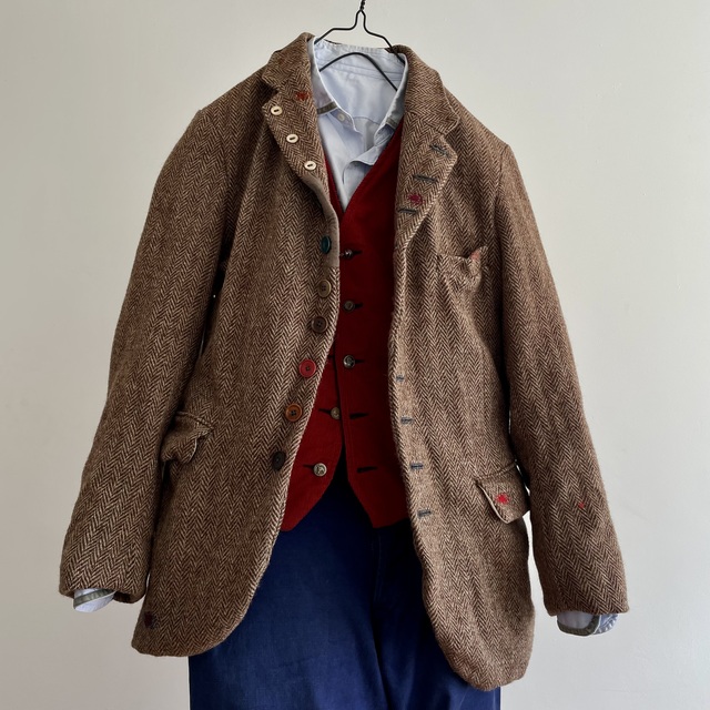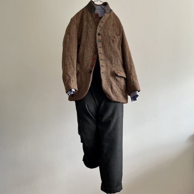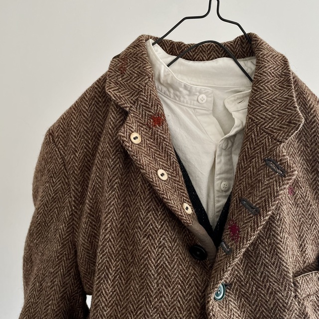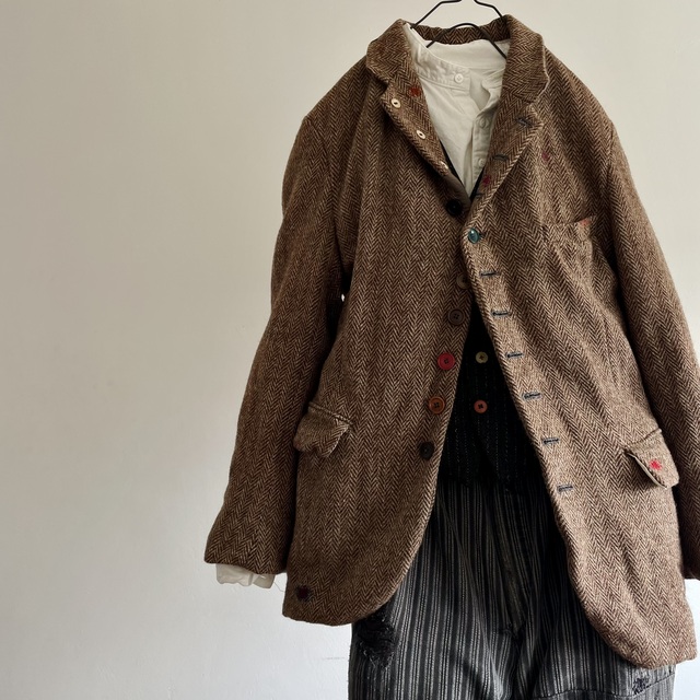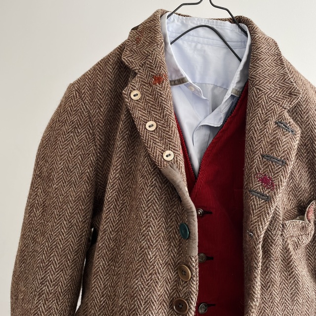 織られた生地に残っていた原毛に含まれる油分が、時間の経過と共に抜け変化した少しパサついた触感は、ヴィンテージのツイードだけが持ち、時間を経なければ手に入らない物。