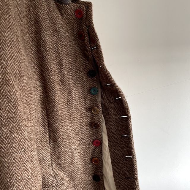 ボタンはさまざま色と形のものをランダムにチョイスした、vintageのcorozo(主にエクアドルのタグワ椰子)。その実の種子の中の胚乳部分を加工して作られた趣のあるボタン。