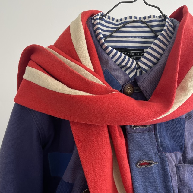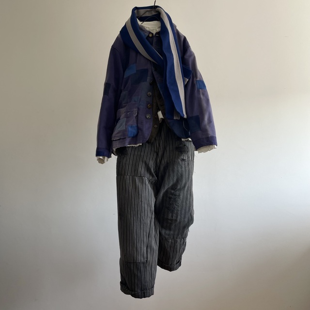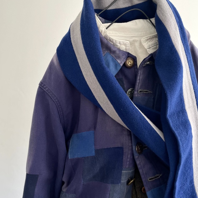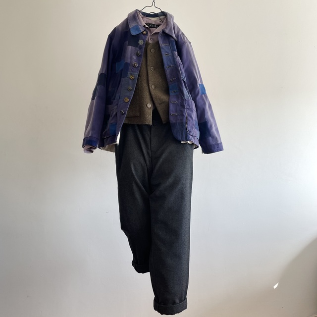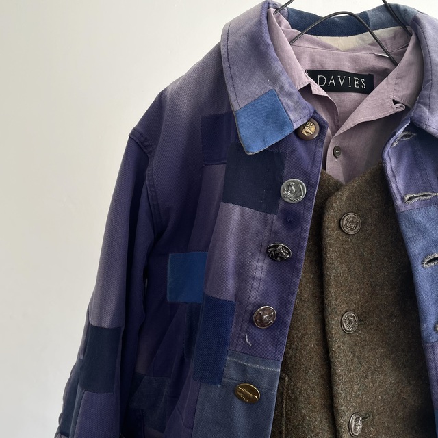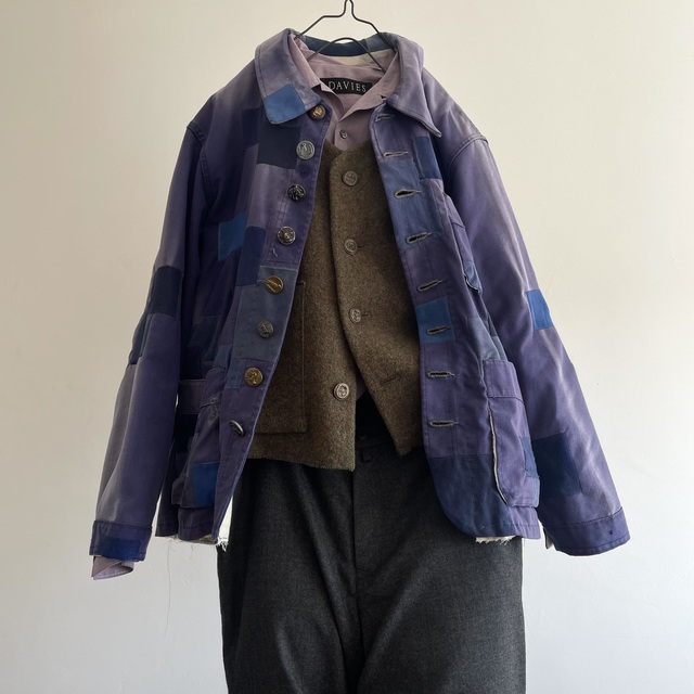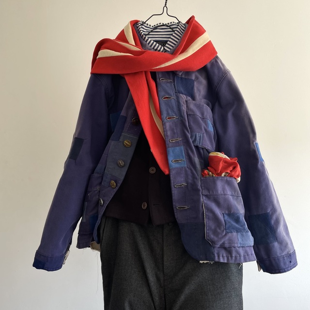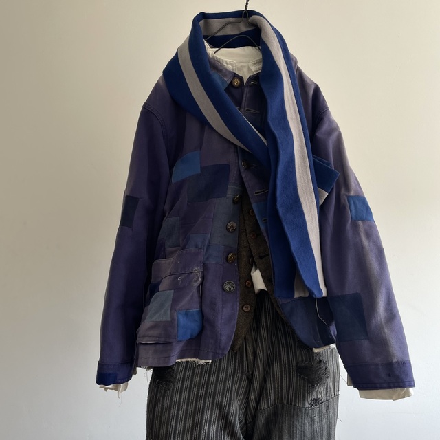 同じ時代のフランスのvintageの、さまざまなワークジャケットから取り出した生地を、全て手でpatchしたモザイク。