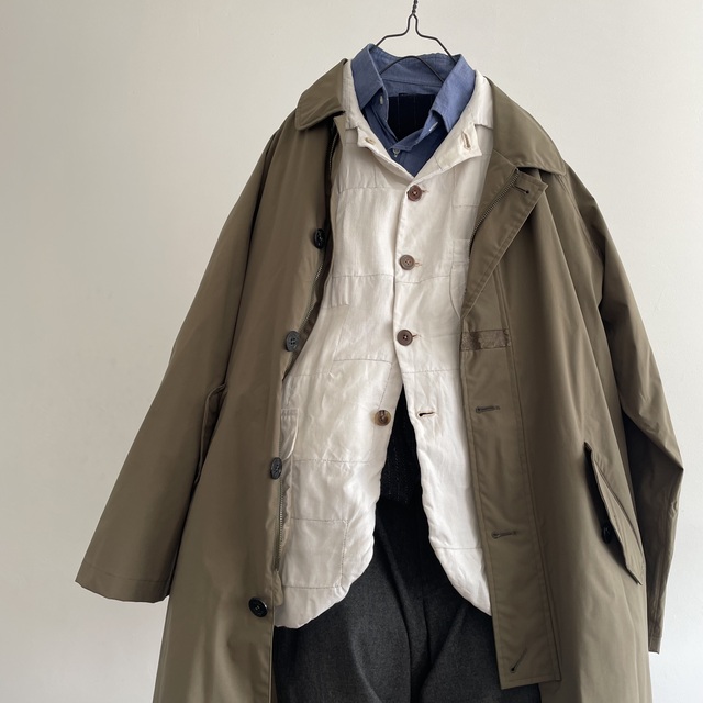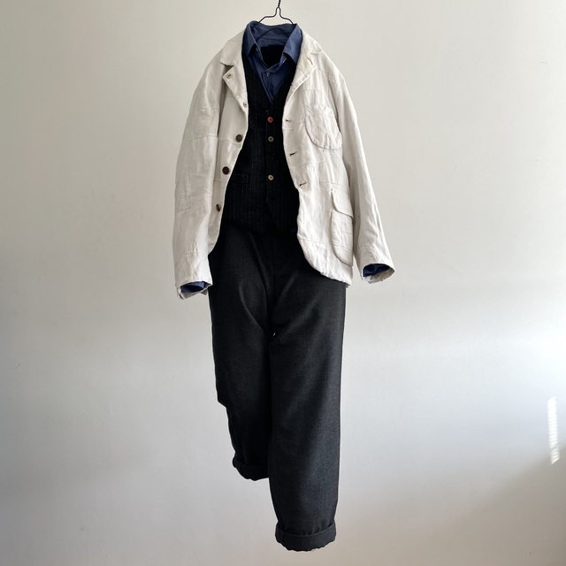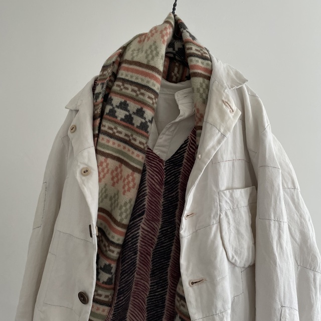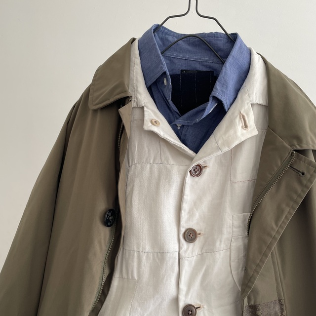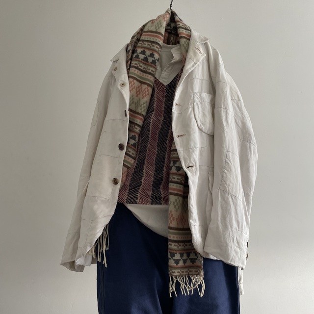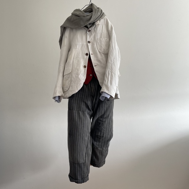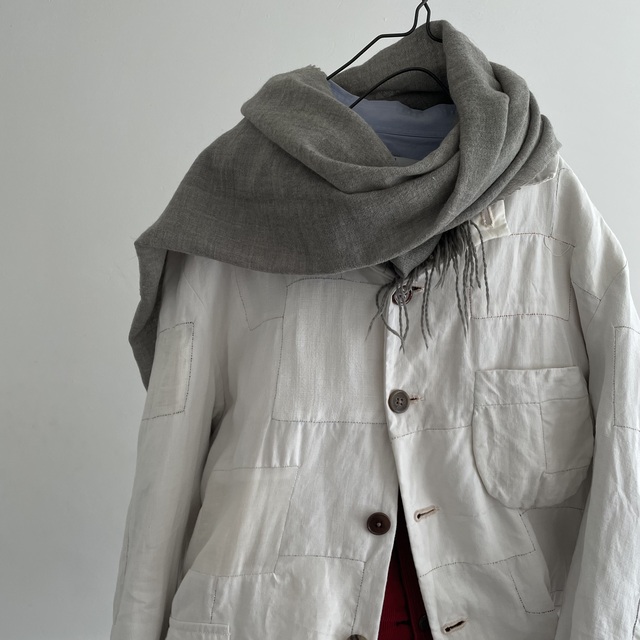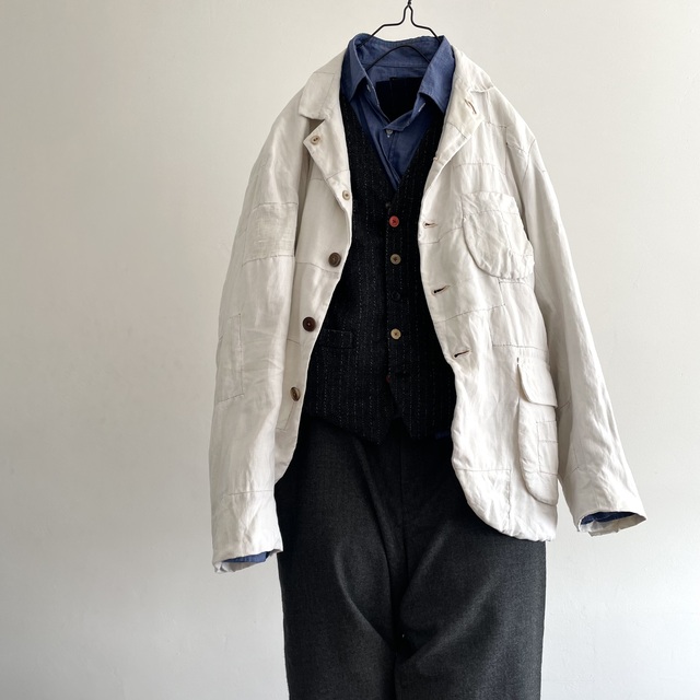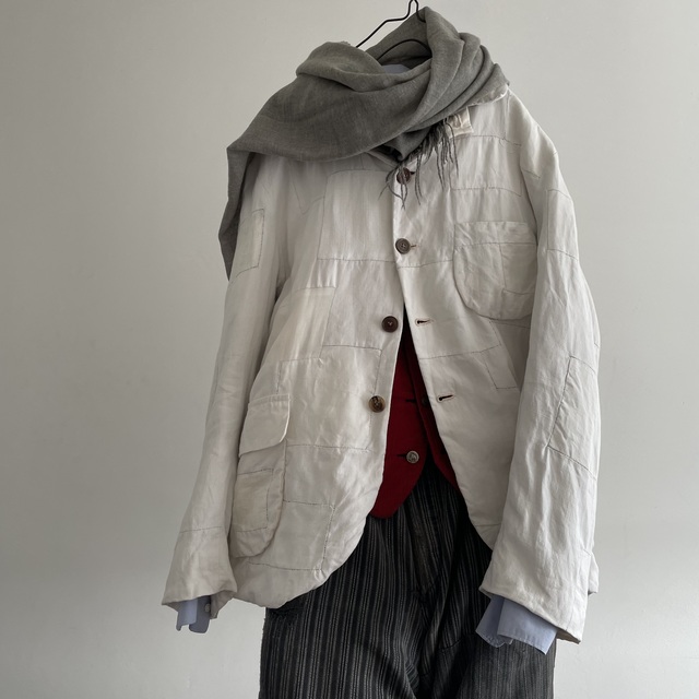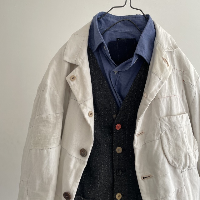 19世紀末~20世紀初頭の、数種類のフランスの手動織機で織られたアンティークリネンを、組み合わせ手縫いでpatchしたジャケット。ゆったりとした分量のゆるやかなシルエットが暖かで爽やかな風の季節に似合う1着です。