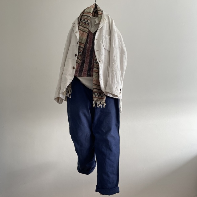 綿素材を輸入に頼るのに比して自国での栽培が盛んで入手が容易で身近なフランスのリネンですが、しっかり着込まれた年月の経過を映す様々な質感と色合いが入り混じる深い趣を持つ生地は、枯れた風合いがさらに味わいを高めています。