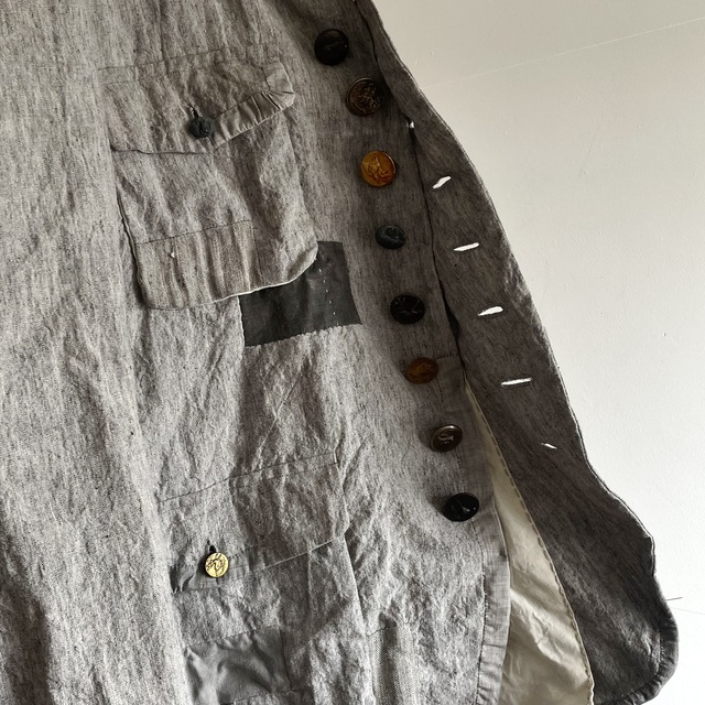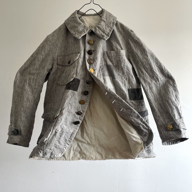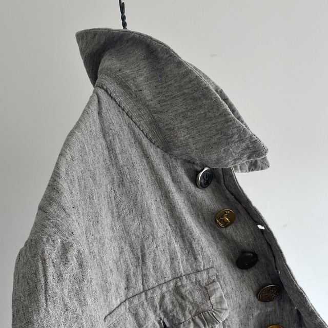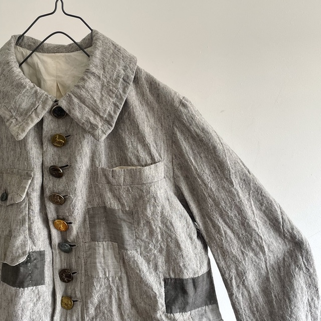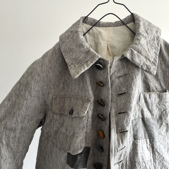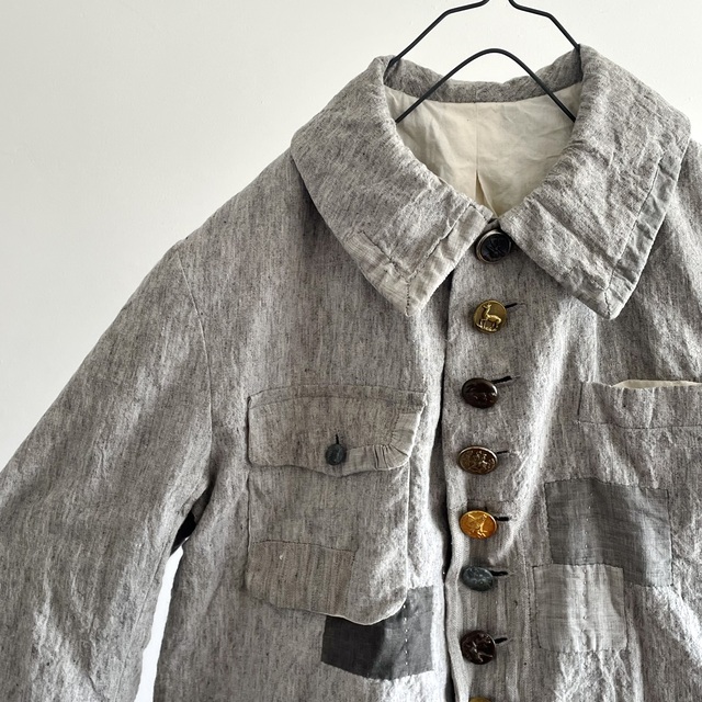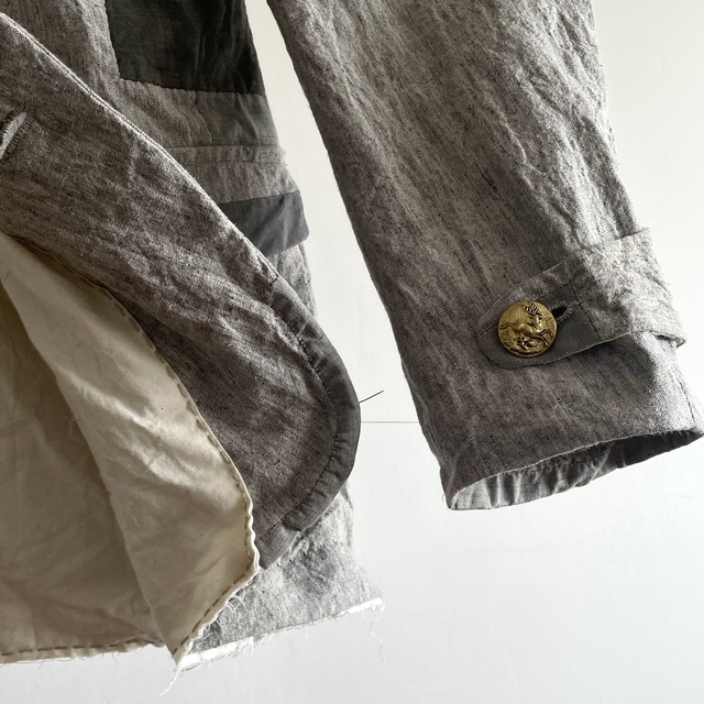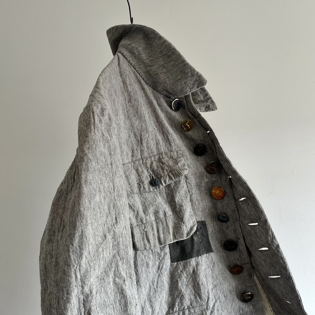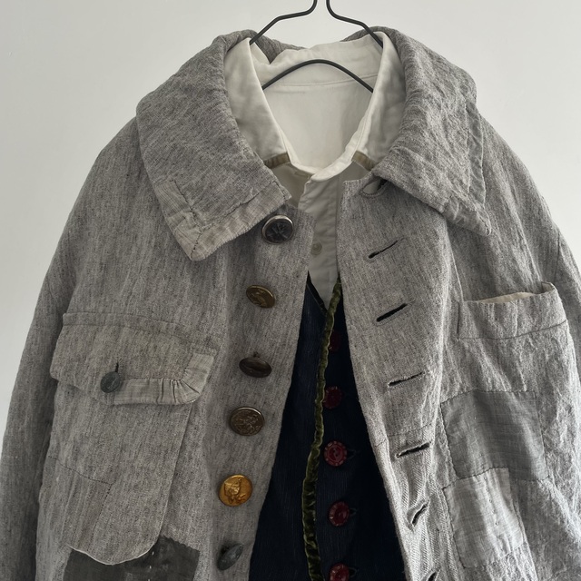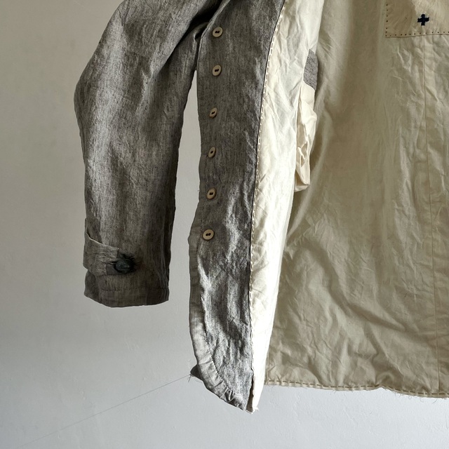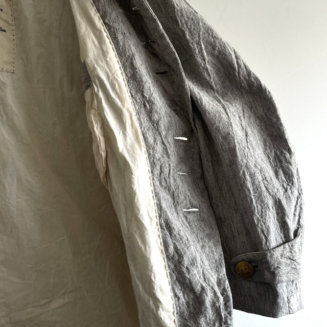ラウンドしたフラットなパターンで、少し大きめの襟の表情は、フランスのヴィンテージならではの独特の雰囲気が漂います。一旦解体してダメージを補修するとともに、細かなステッチを入れたアンティークリネンの裏襟に変更しています。