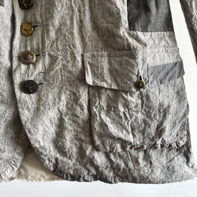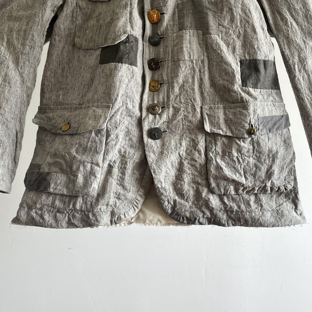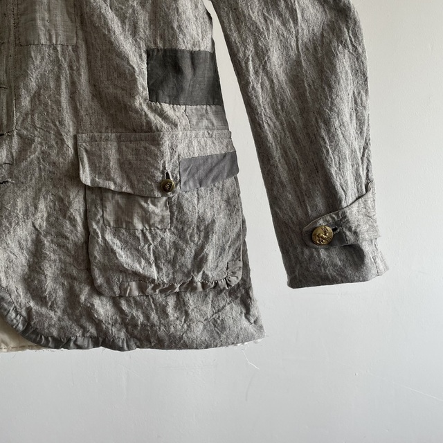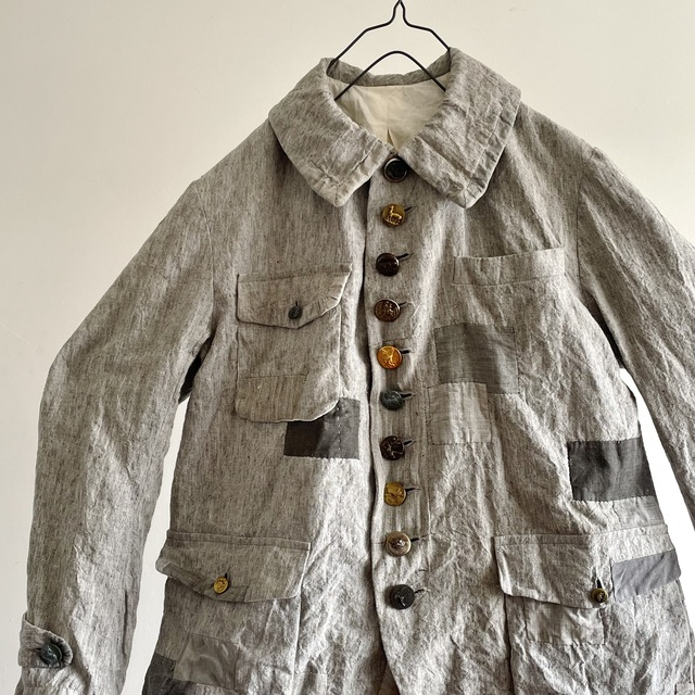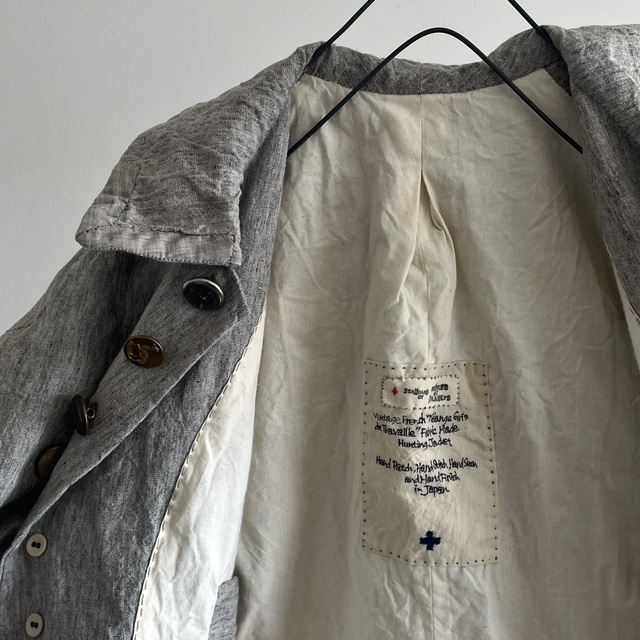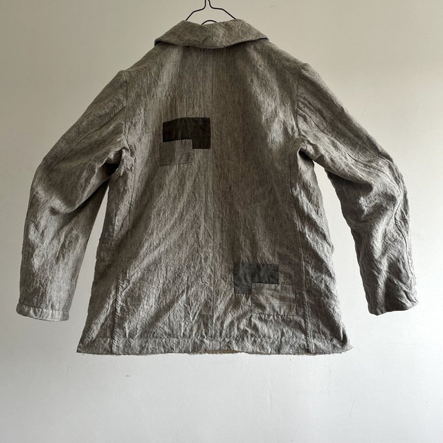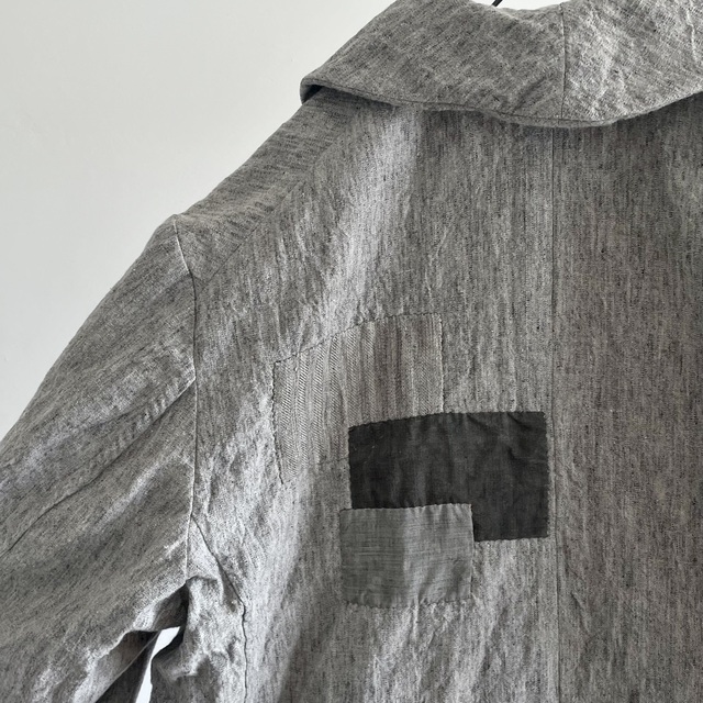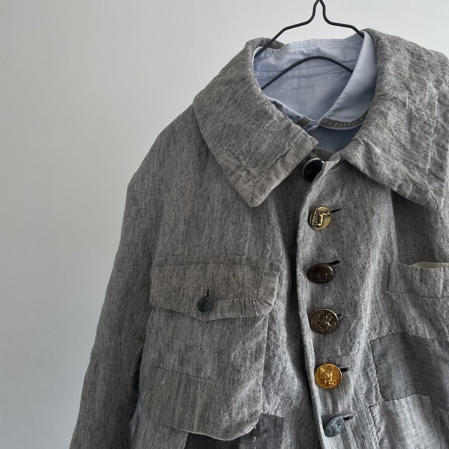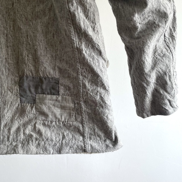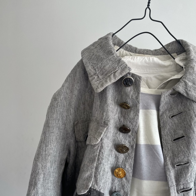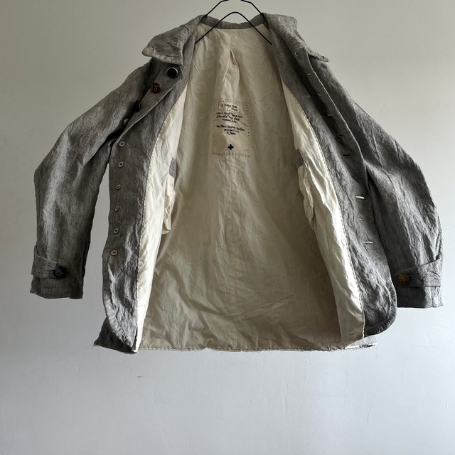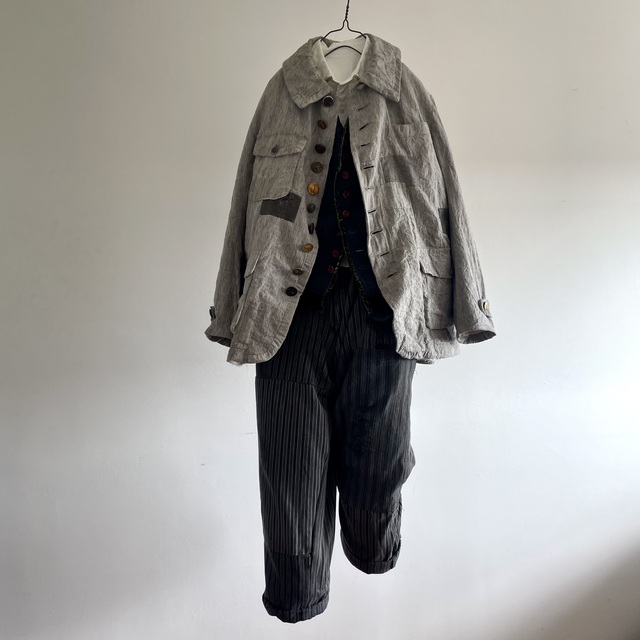 ラウンドしたフラットなパターンで、少し大きめの襟の表情は、フランスのヴィンテージならではの独特の雰囲気が漂います。一旦解体してダメージを補修するとともに、細かなステッチを入れたアンティークリネンの裏襟に変更しています。