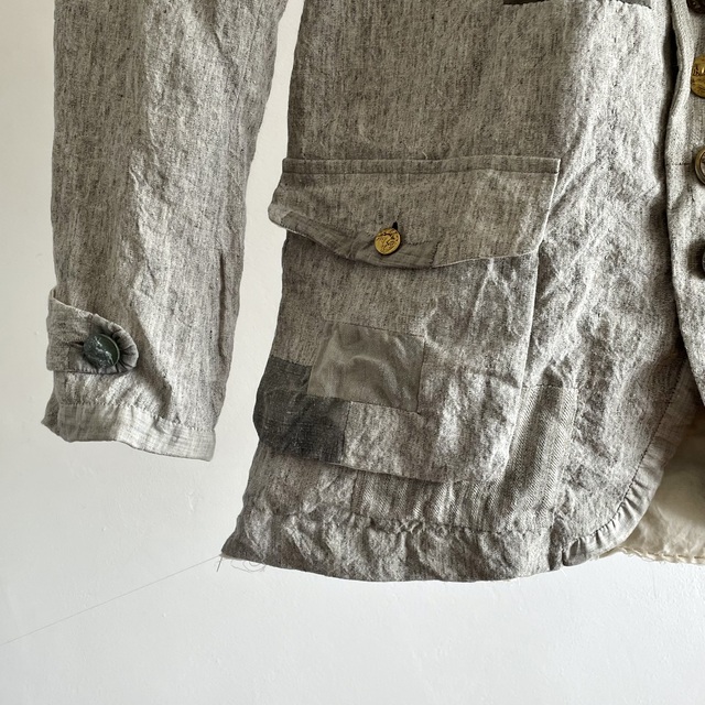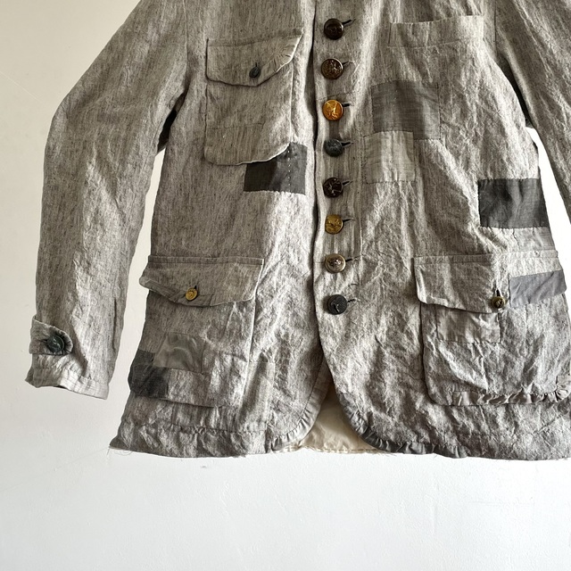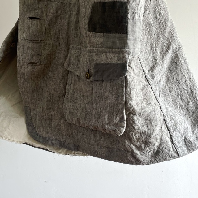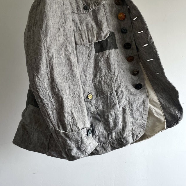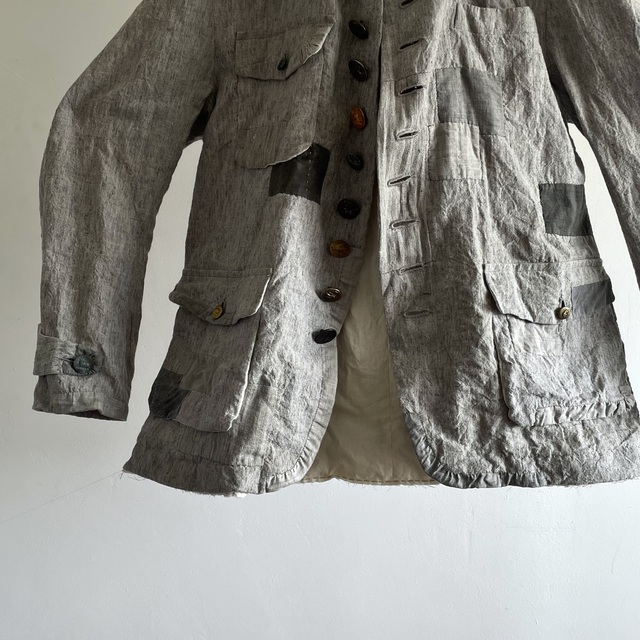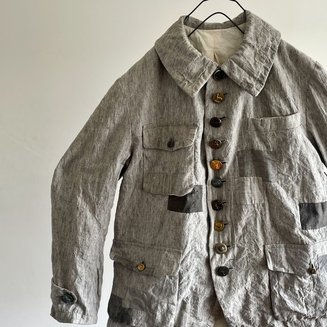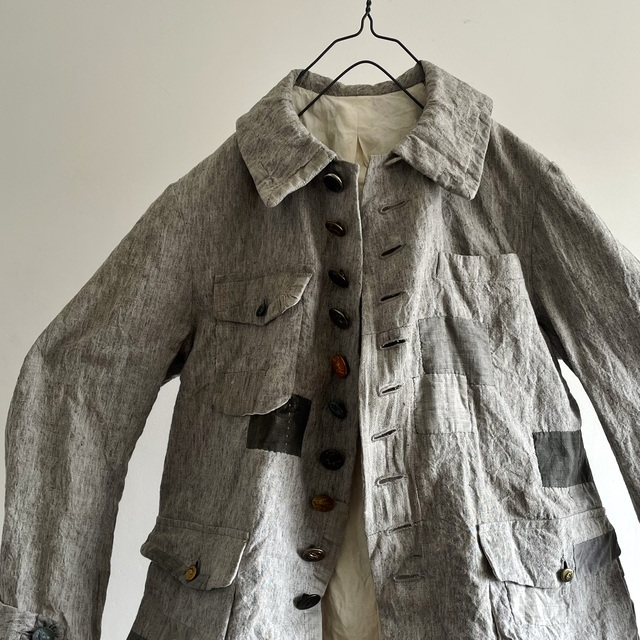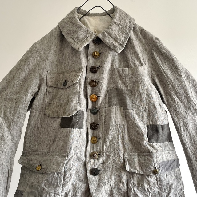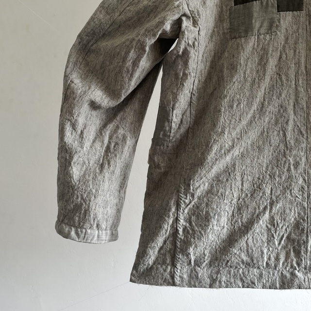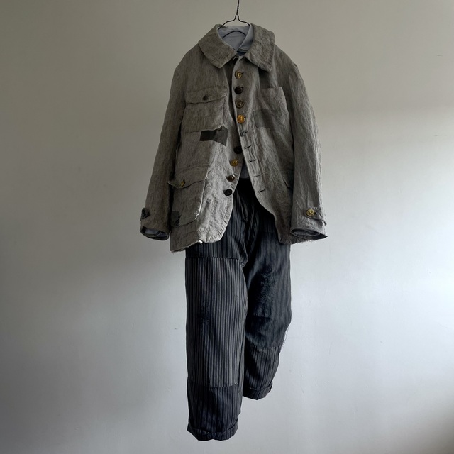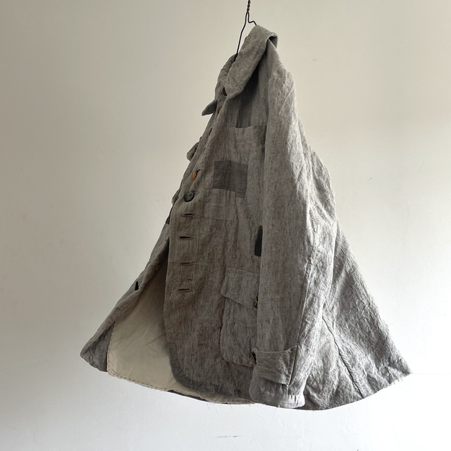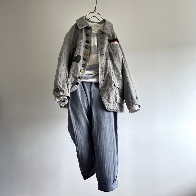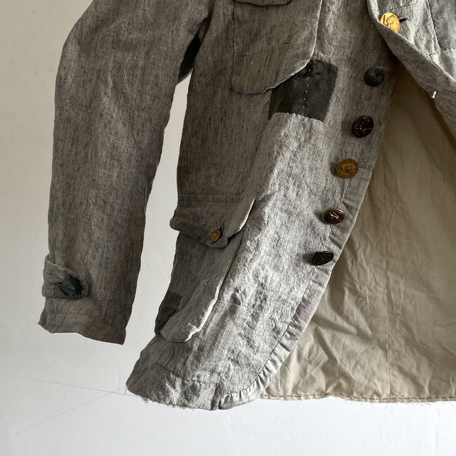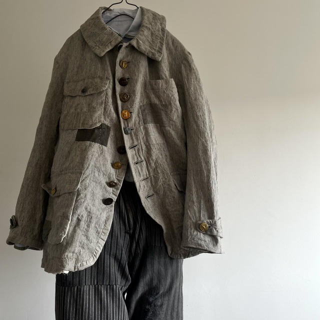 ジビエの季節の秋や冬とはまた違った、いわばハンティングのオフシーズンとも言える春や秋の季節に向けてのリネン生地のジャケット。まだ素朴さが残る生地は、古いリネン特有の力強さを持っています。