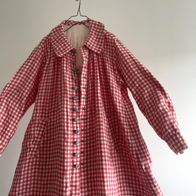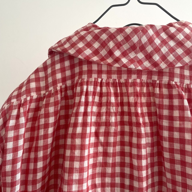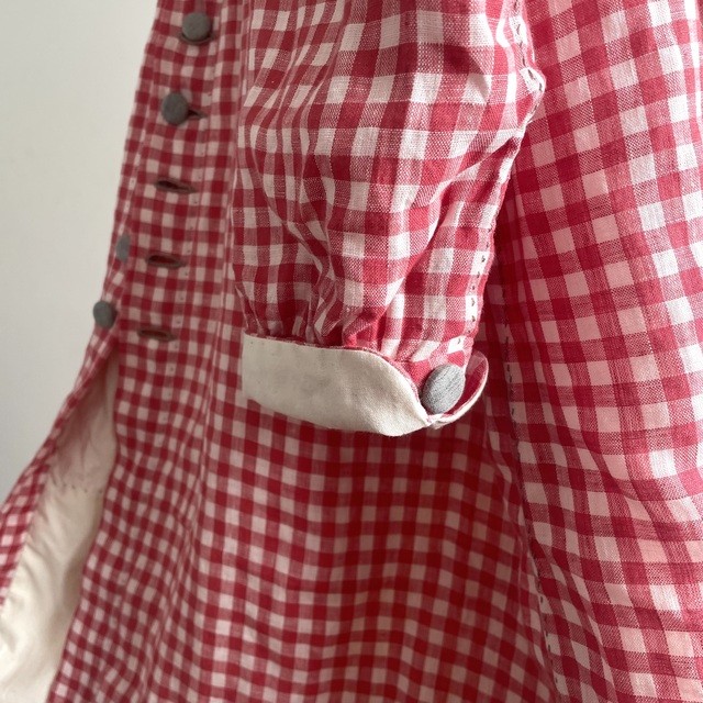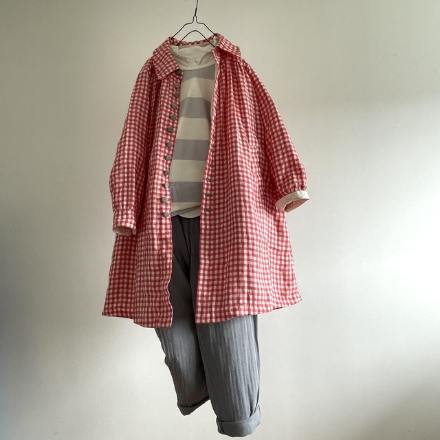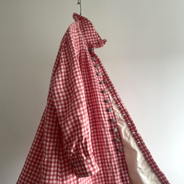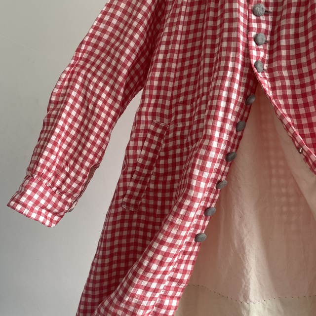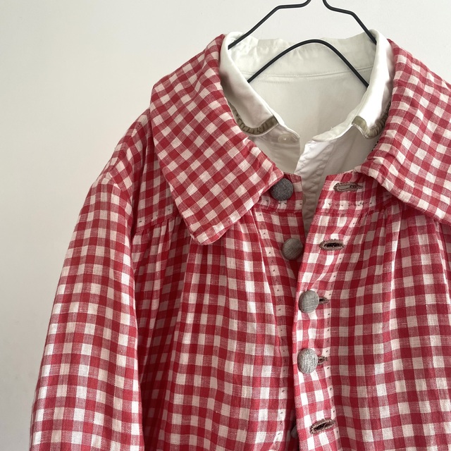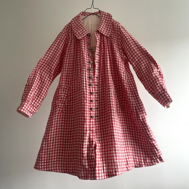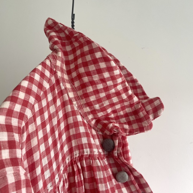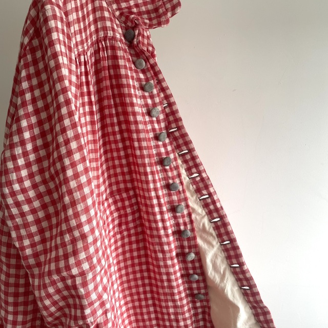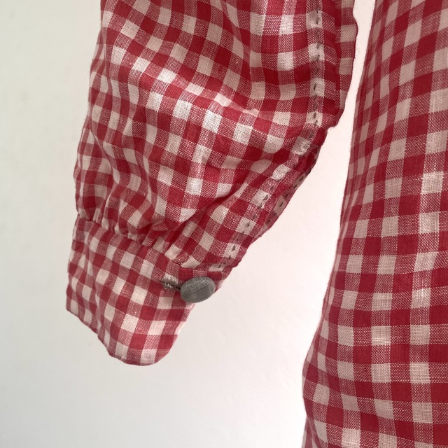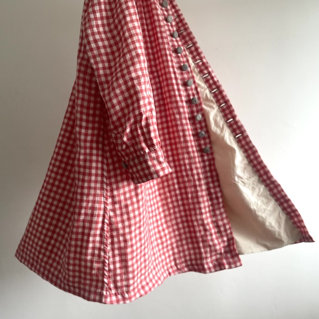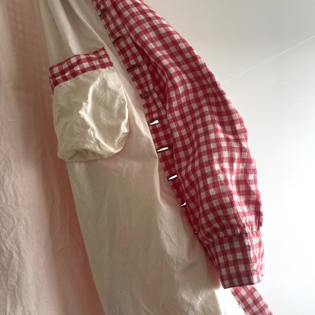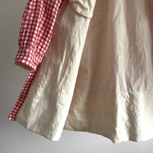 様々な色の組み合わせの中でも、とりわけフランスらしさが感じられるオフホワイトと赤のギンガムチェック。この生地を見ると、ギンガムの発祥はマレー語の「Genggang」ではなく、フランス北西部、ブルターニュのイギリス海峡に臨む田舎町Guingampなのだという説に1票を投じたくなります。