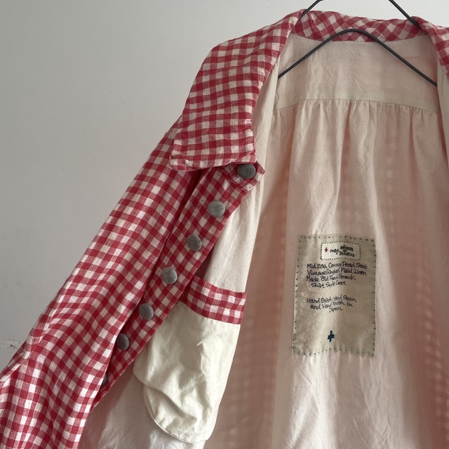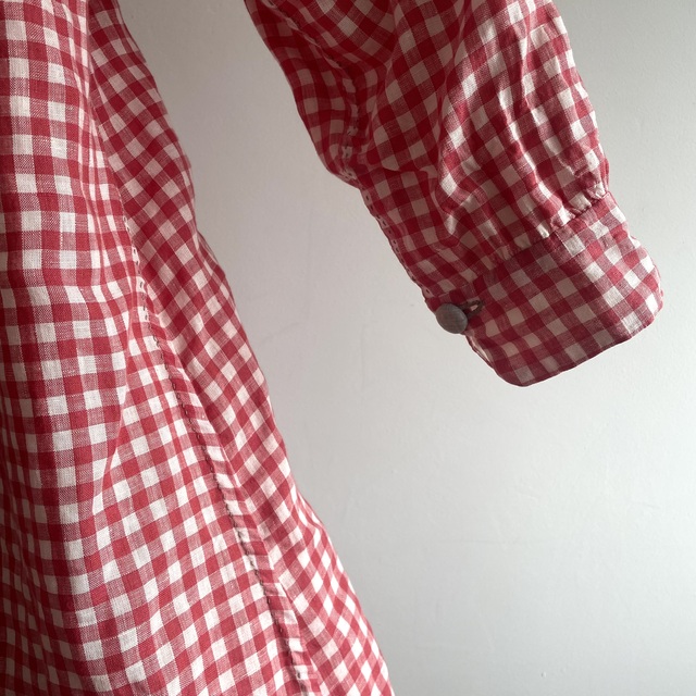 Mid 20th Century Dead Stock Vintage Gingham Plaid Linen Fabric Made Old French Smock Shirt Style Coat