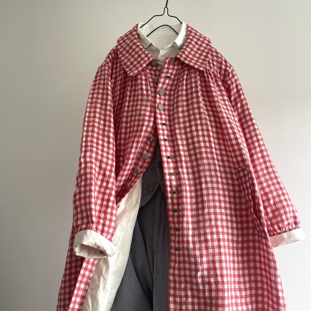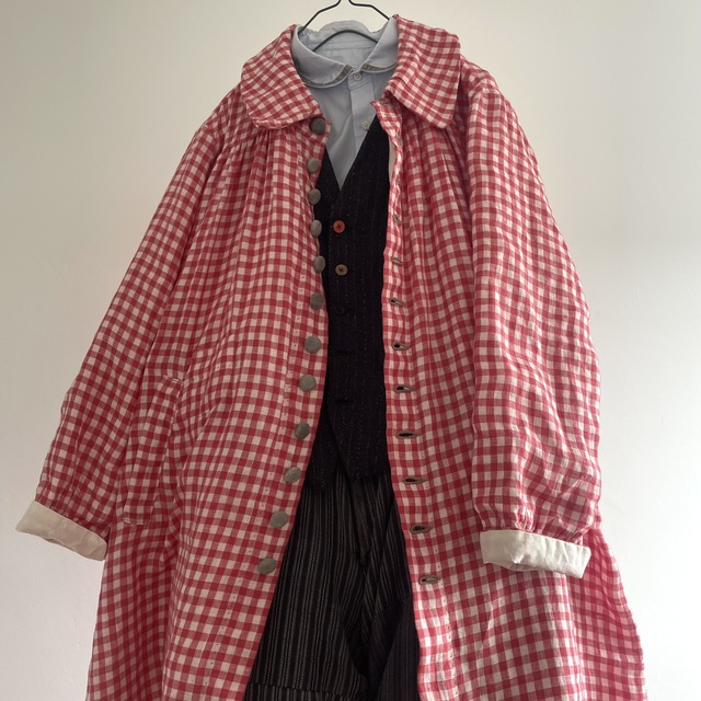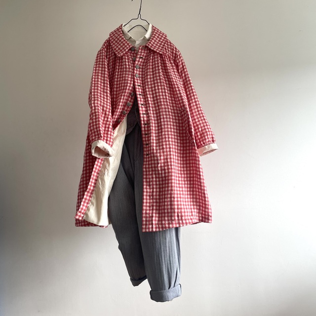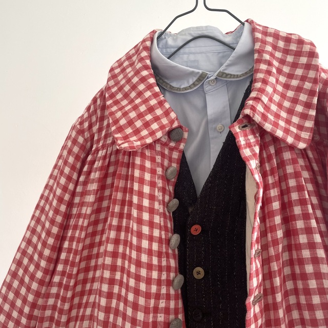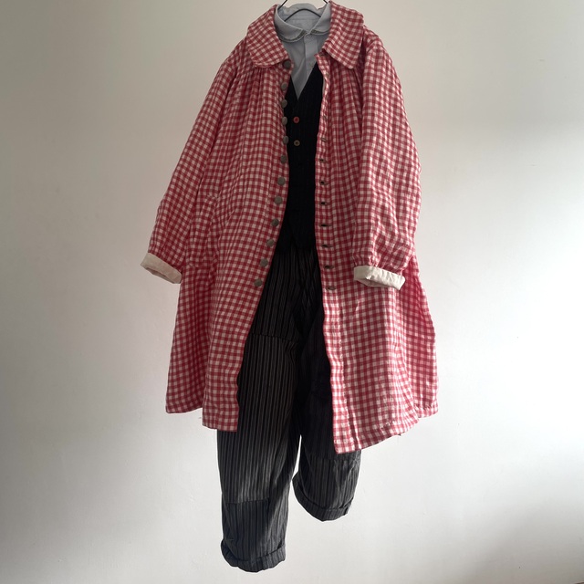 Vintageの生地と、今はもう作られなくなった仕事着のフォルム。そこに乾いた手の仕事と現代性を融合させて作り上げた、「古くて新しく、新しいけど古い」もの。