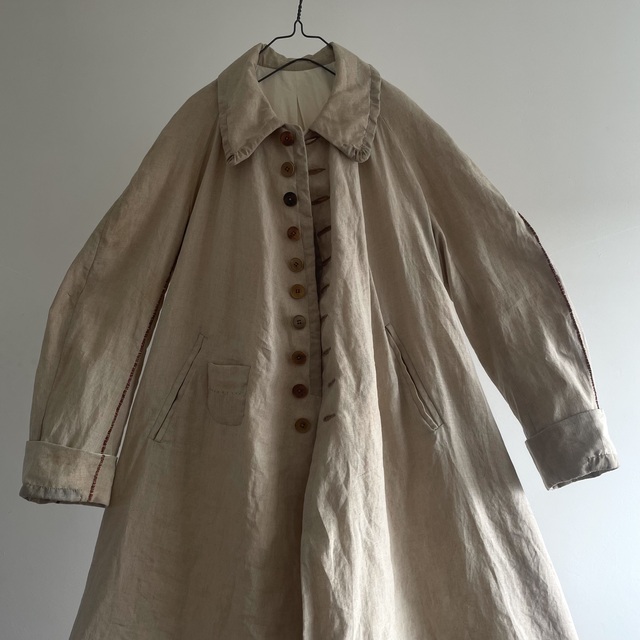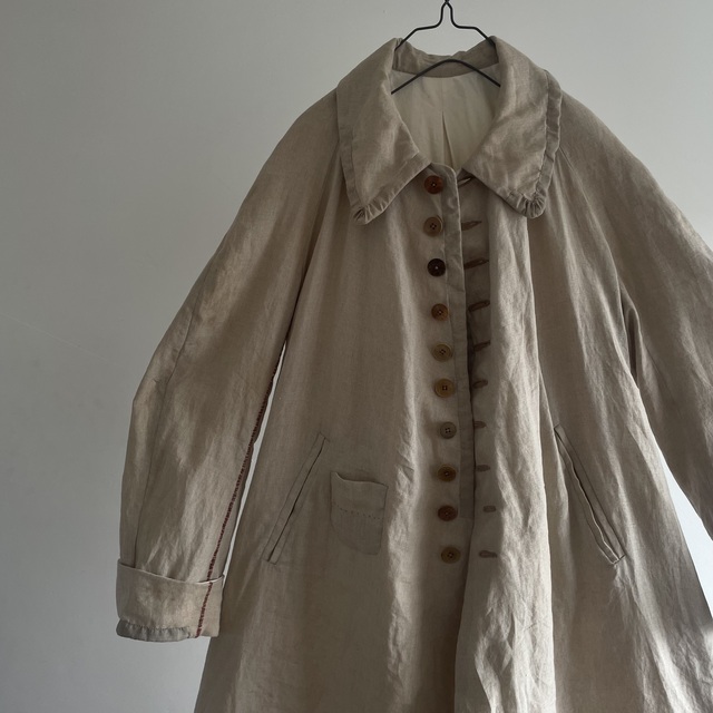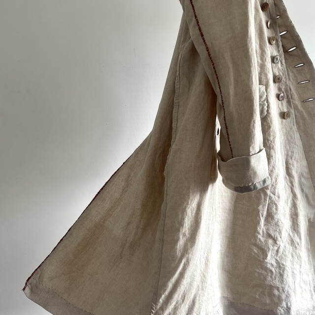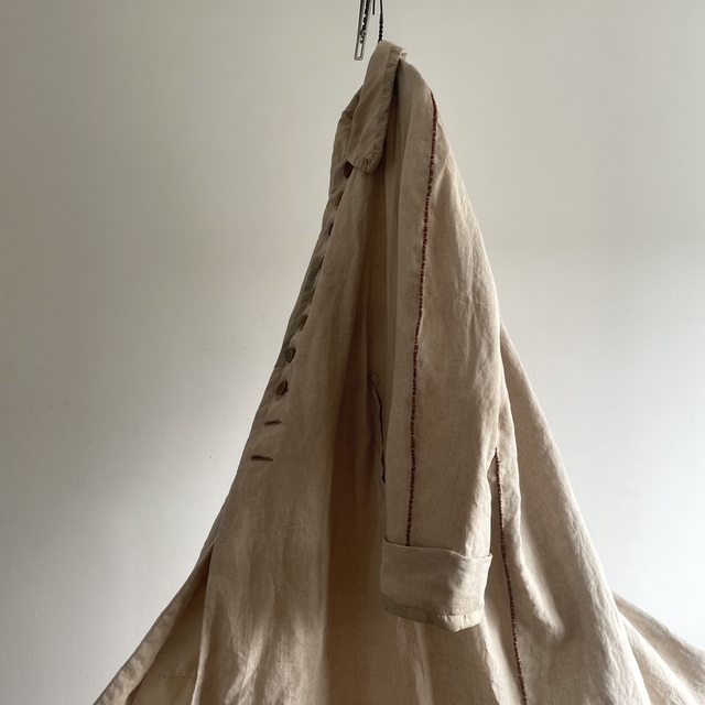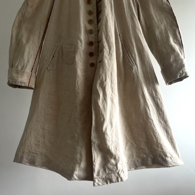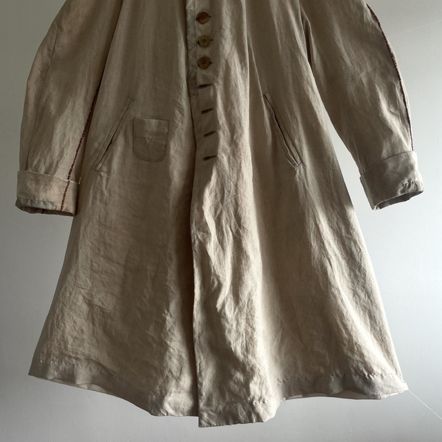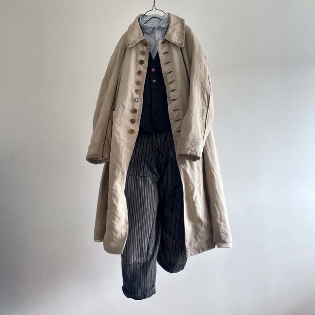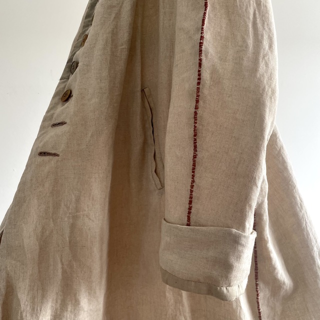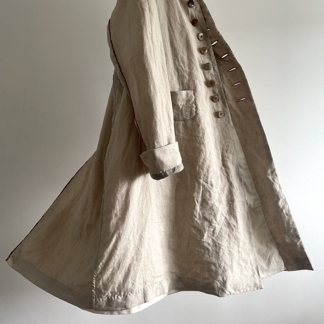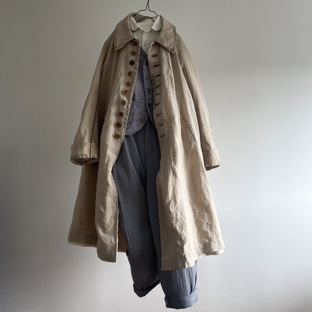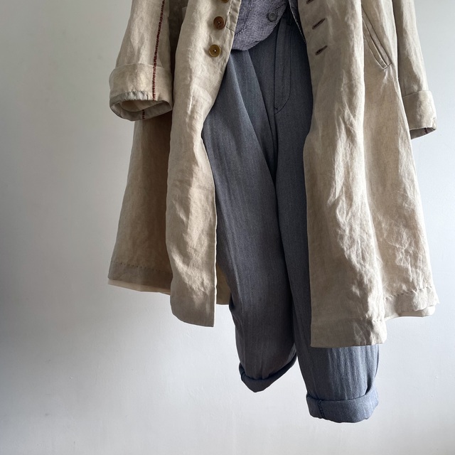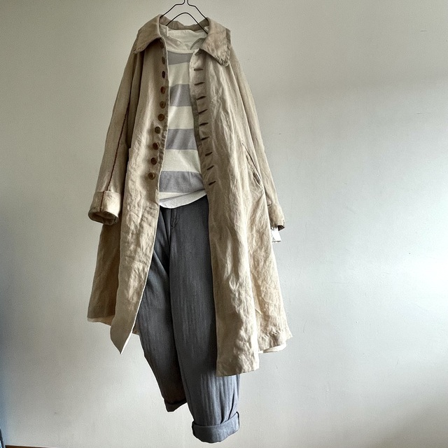 長めの丈とたっぷりした分量、使い込まれたリネンの生地感があいまった存在感あふれる1着です。