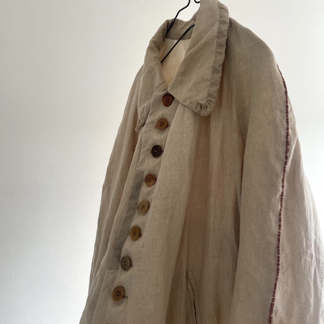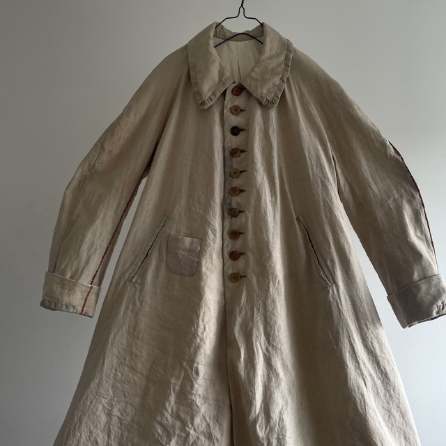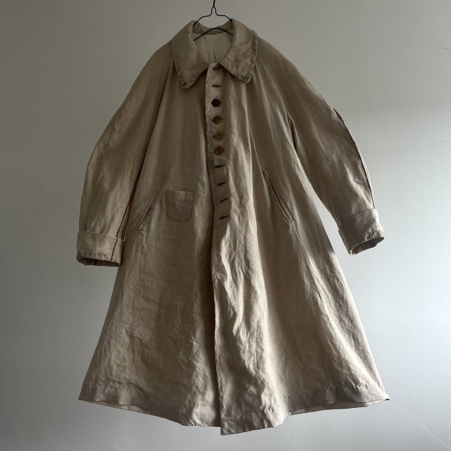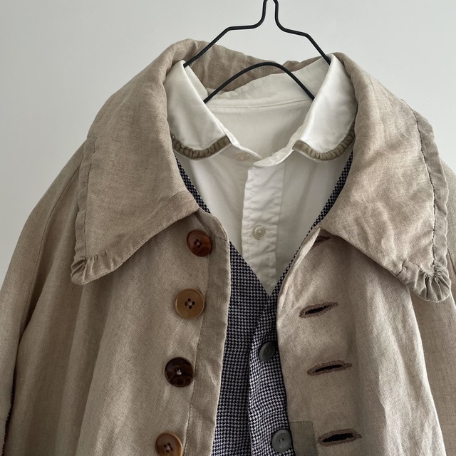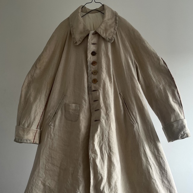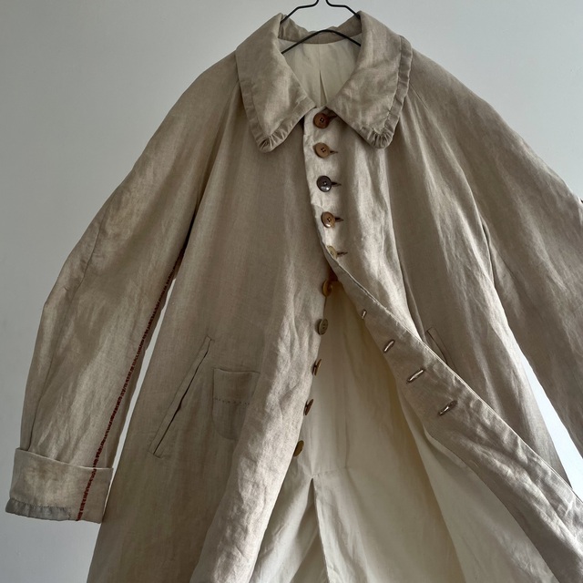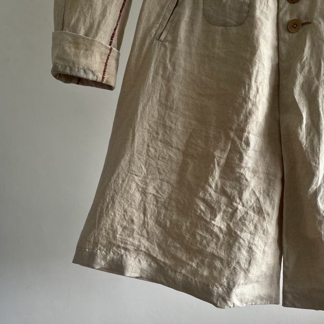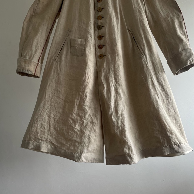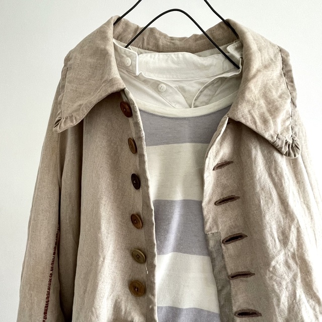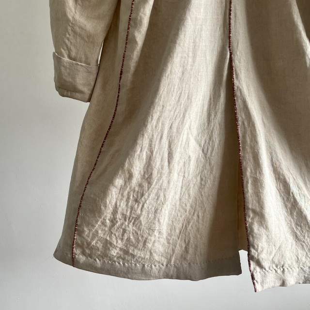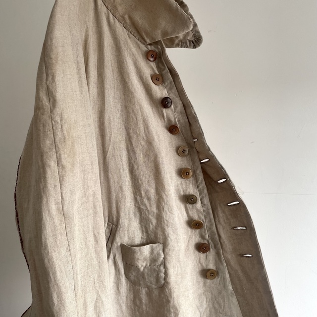 長めの丈とたっぷりした分量、使い込まれたリネンの生地感があいまった存在感あふれる1着です。