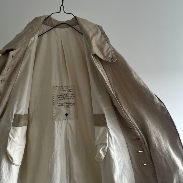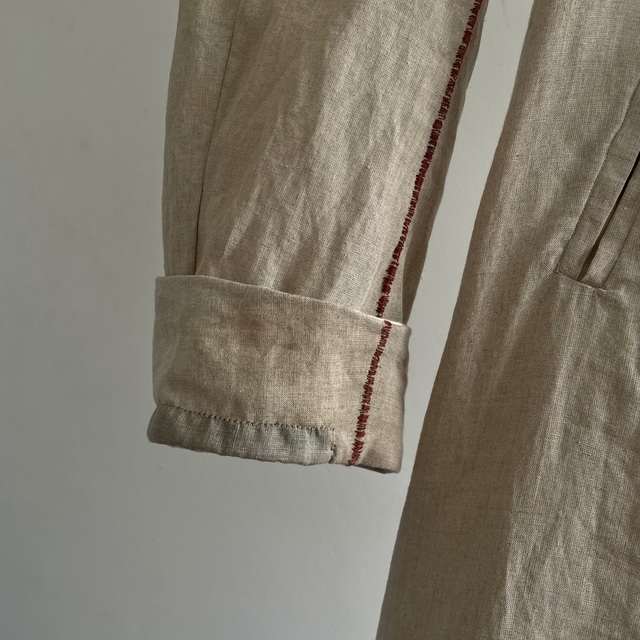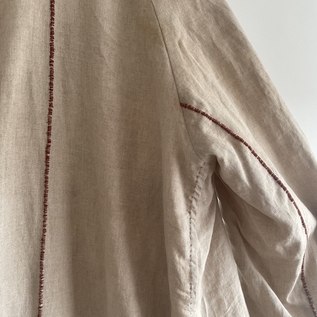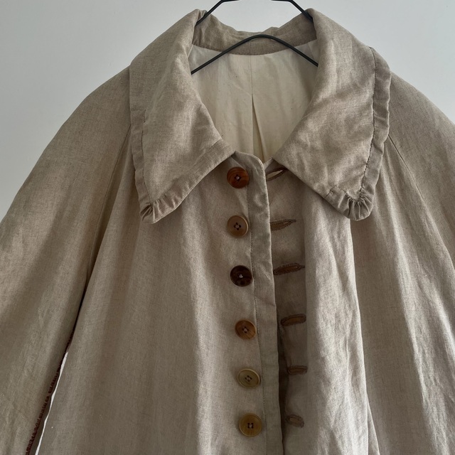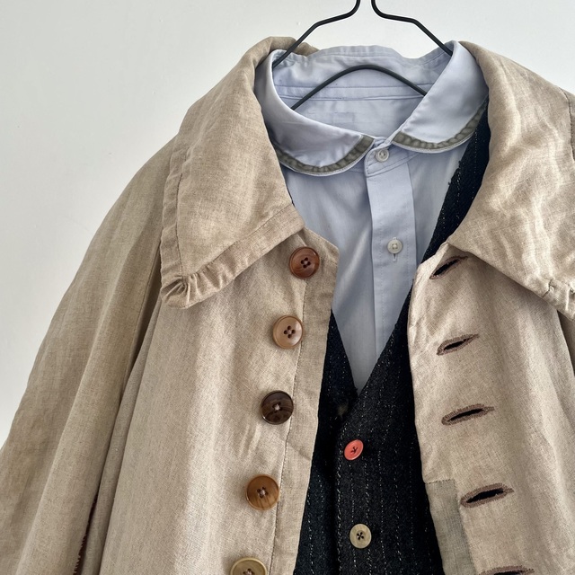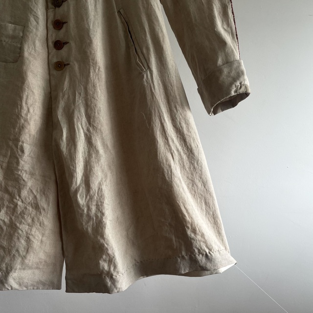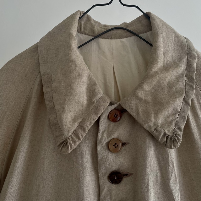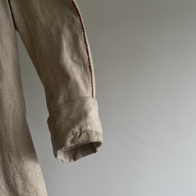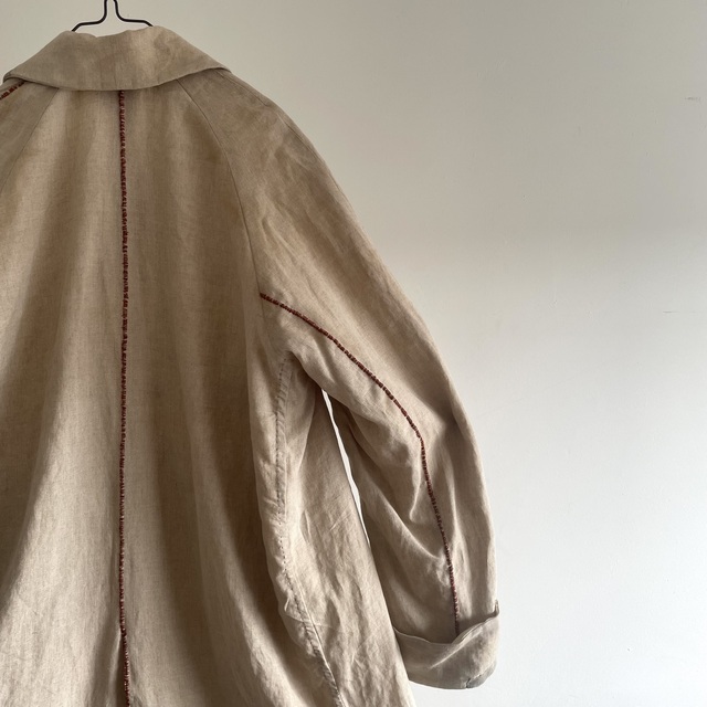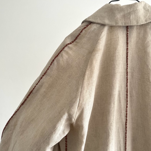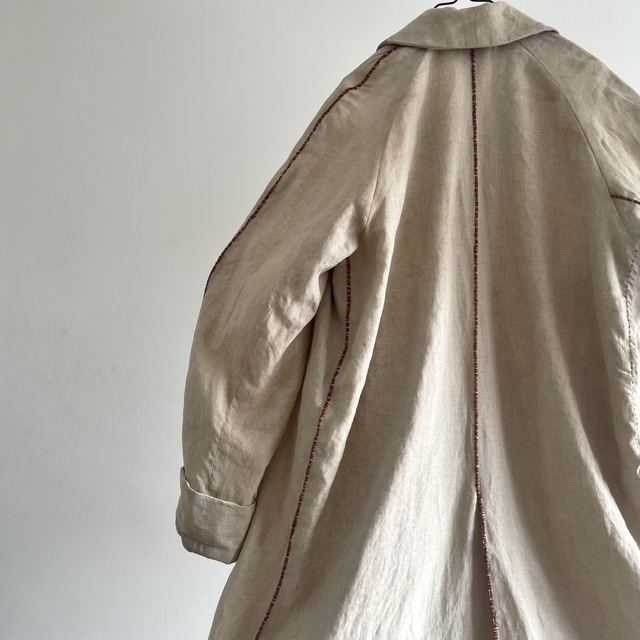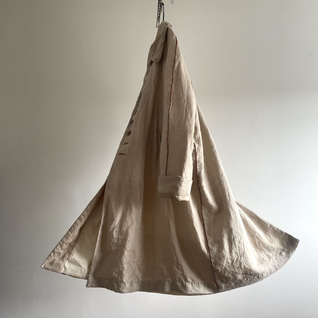 長めの丈とたっぷりした分量、使い込まれたリネンの生地感があいまった存在感あふれる1着です。